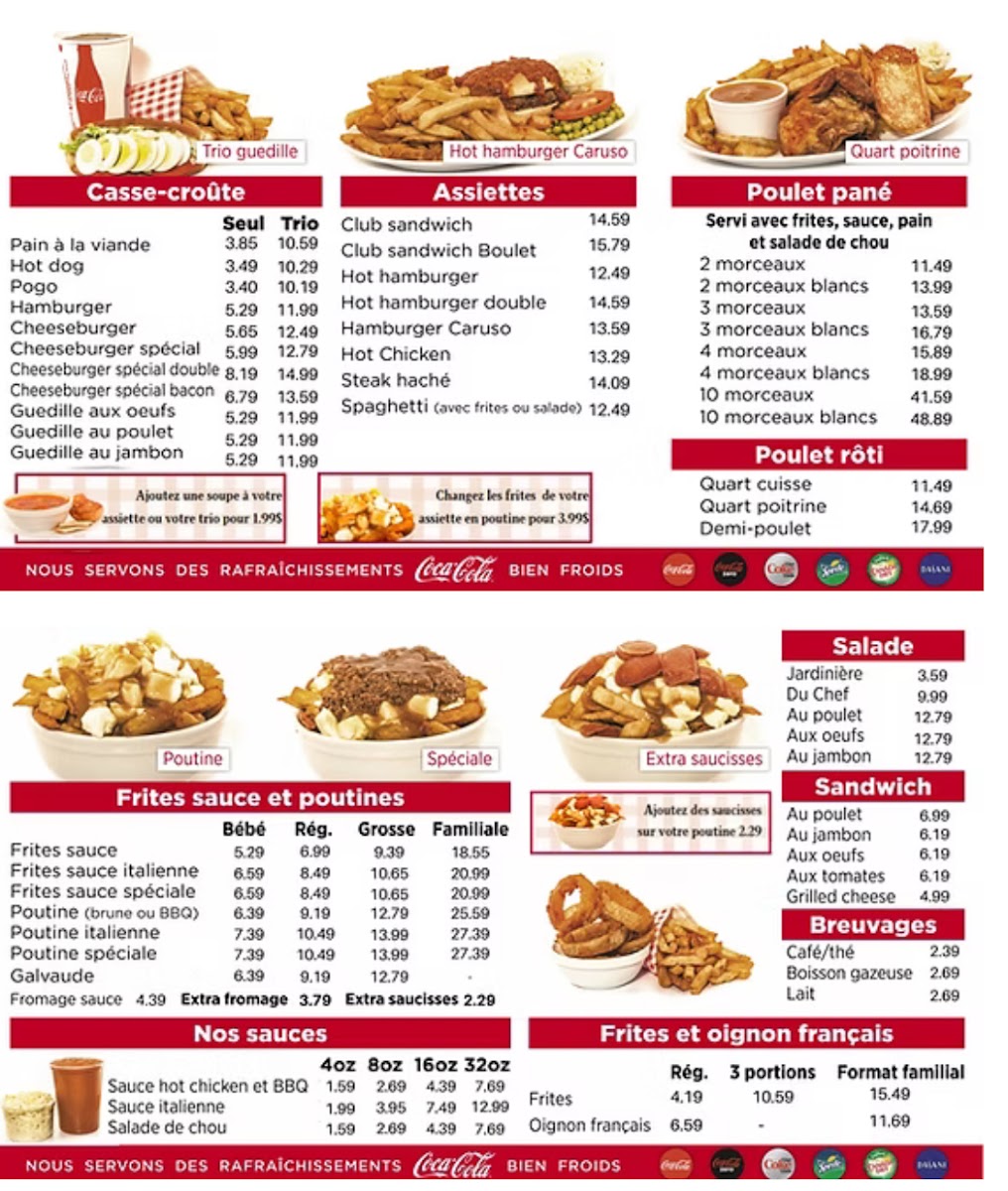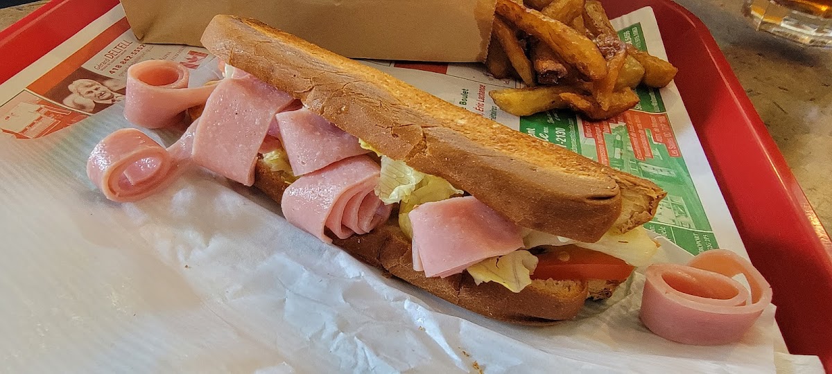 La Cuisine Boulet offers a variety of plates and snacking options, from hearty Spaghetti with fries or salad (CA$14.19) to the classic Cheeseburger (CA$6.84), catering to both traditionalists and those looking to explore. The Club Sandwich Boulet (CA$16.49) stands out with its generous portion of ham and cheese, served alongside crispy fries and tangy coleslaw, making it a flavorful and fulfilling choice.